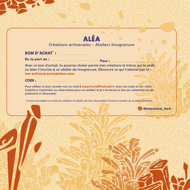 Vous cherchez une idée de cadeau qui soutient l’artisanat local ? Le bon d’achat permet à la personne qui le reçoit de s’offrir une de mes créations ou un atelier d’impression artisanale.