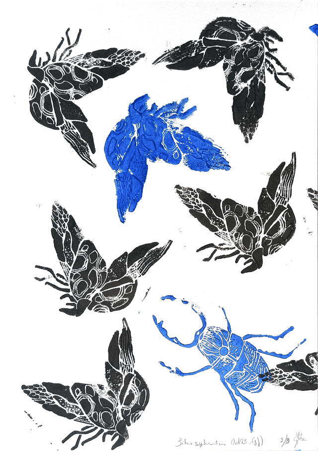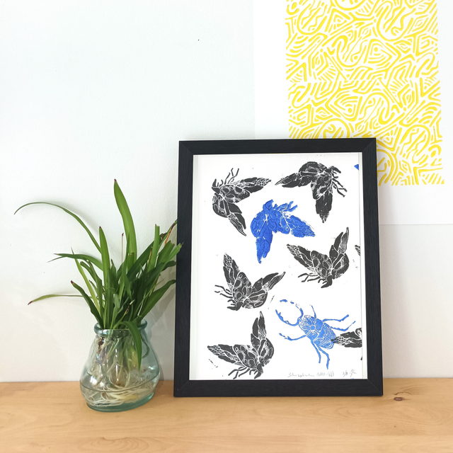 Caractéristiques : Exemplaire unique ◦ Gravure sur linoléum ◦ Papier 250g ◦ Encre pour linogravure Gerstaecker noir et bleu outremer ◦ Exemplaire 2/9 signé et numéroté ◦ Taille : A4 (21 x 29.7 cm)