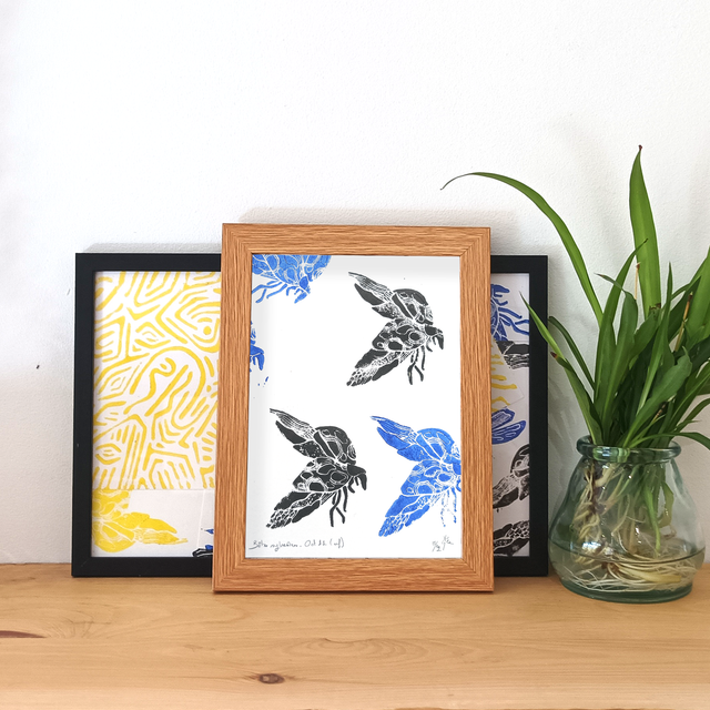 Caractéristiques : Exemplaire unique ◦ Gravure sur linoléum ◦ Papier 250g ◦ Encre pour linogravure Gerstaecker noir et bleu outremer ◦ Exemplaire 2/9 signé et numéroté ◦ Taille : A5 (21 x 14.8 cm)