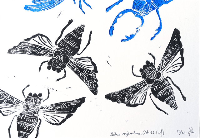 Caractéristiques : Exemplaire unique ◦ Gravure sur linoléum ◦ Papier 250g ◦ Encre pour linogravure Gerstaecker noir et bleu outremer ◦ Exemplaire 2/9 signé et numéroté ◦ Taille : A5 (21 x 14.8 cm)