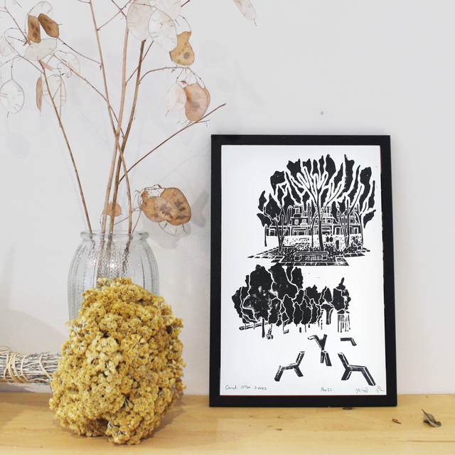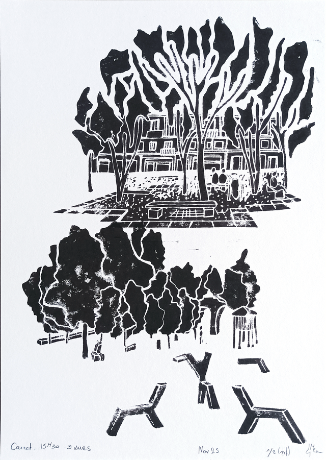 Linogravure réalisée à la main.
